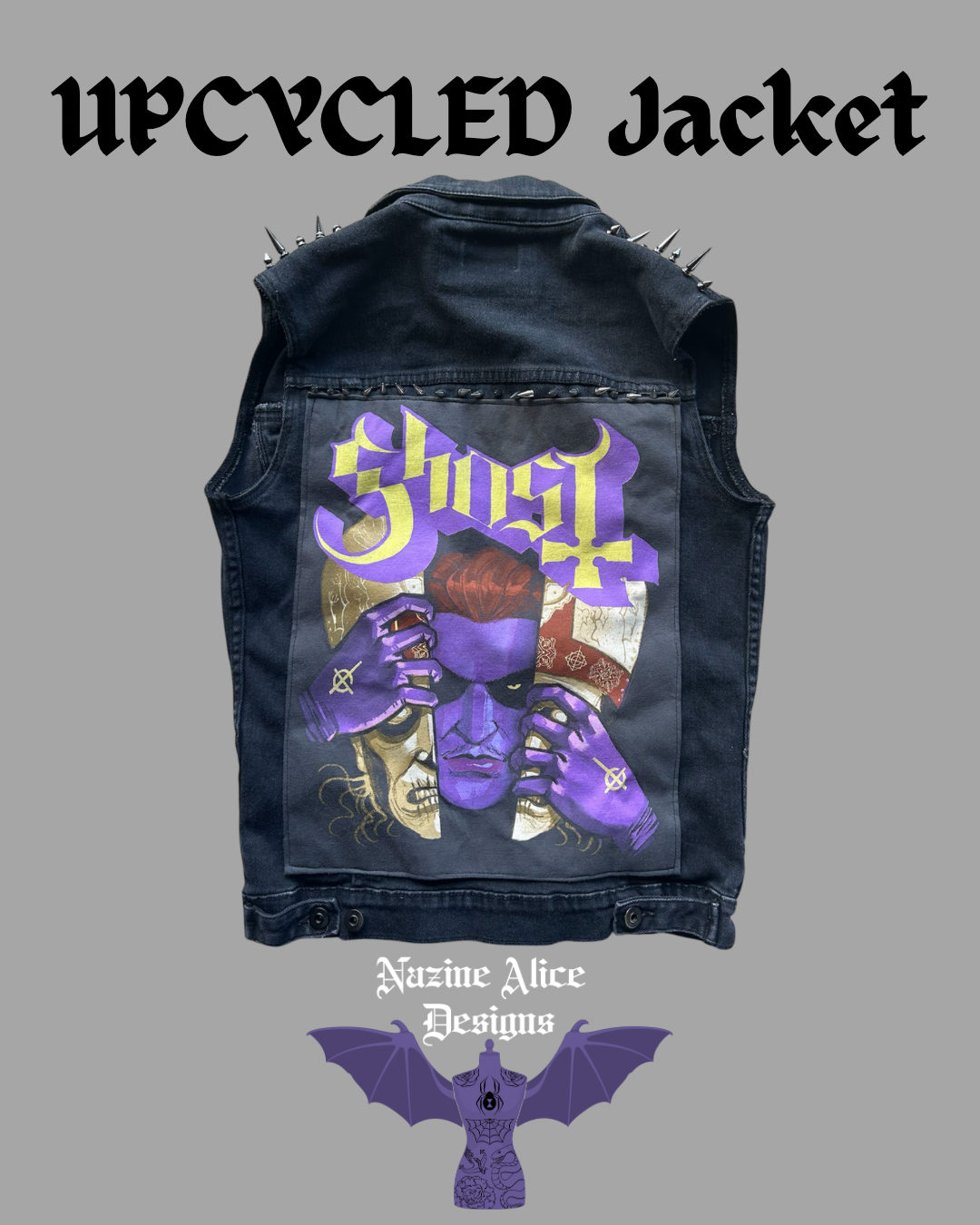 A great quality secondhand Jacket restored and studs added with a print tee cut out as a stand out back patch! Ready to be worn as it is, or adorn with your own patches as a battle jacket!