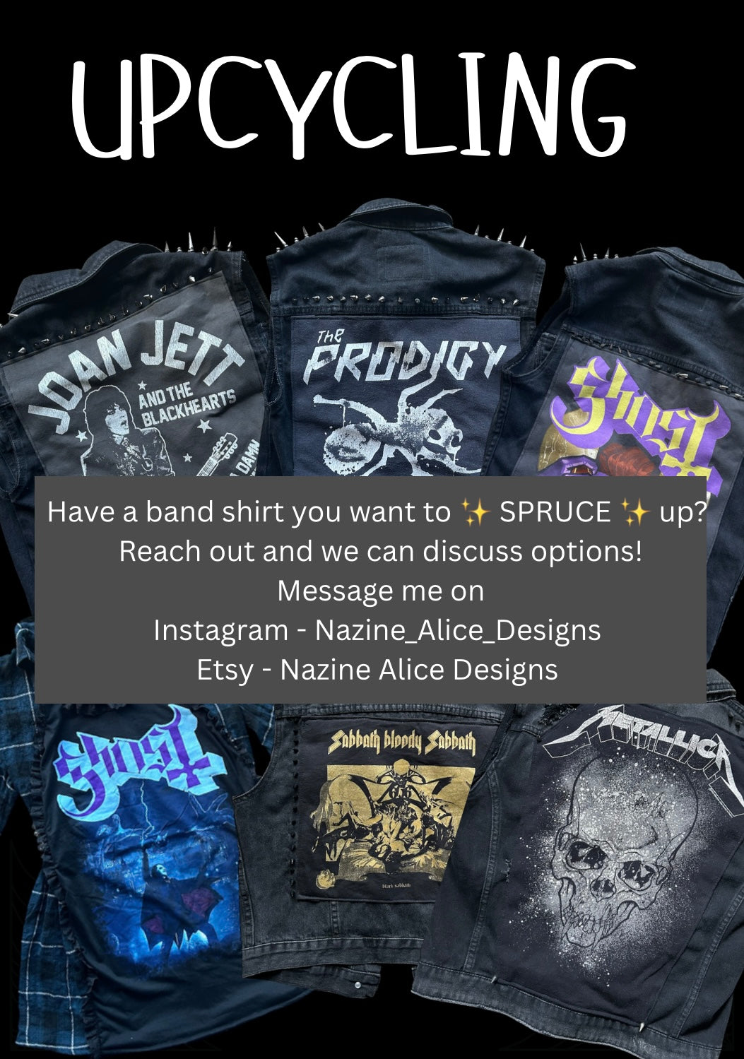 A great quality secondhand Jacket restored and studs added with a print tee cut out as a stand out back patch! Ready to be worn as it is, or adorn with your own patches as a battle jacket!
