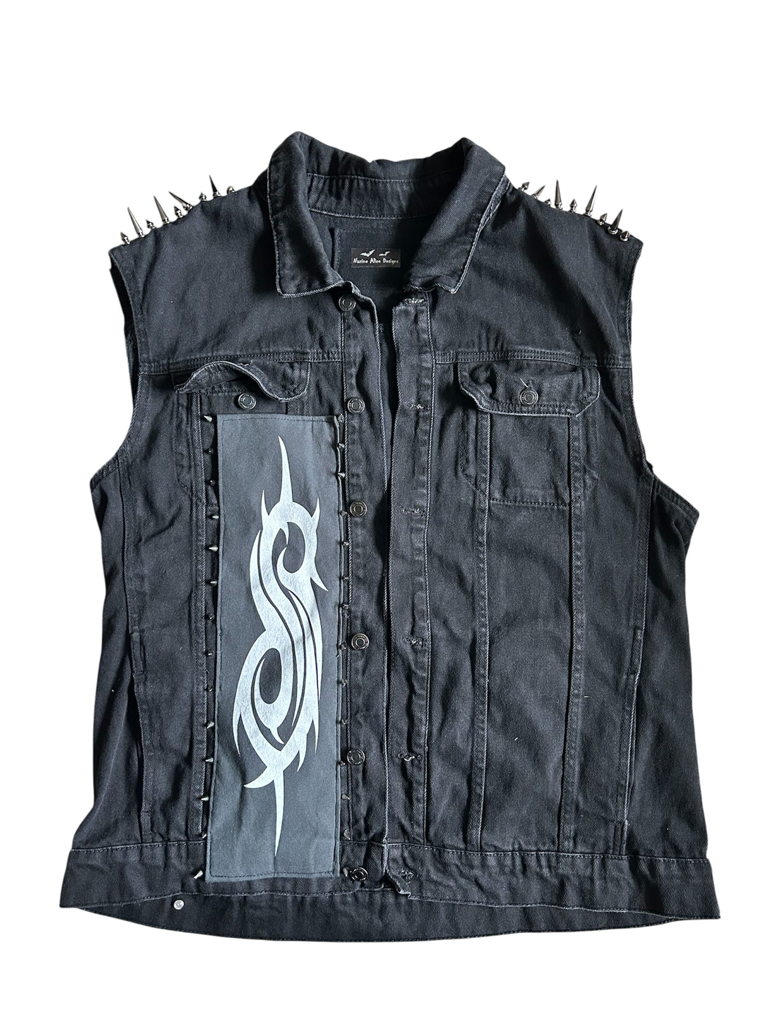 A great quality secondhand Jacket restored and studs added with a print tee cut out as a stand out back patch! Ready to be worn as it is, or adorn with your own patches as a battle jacket!