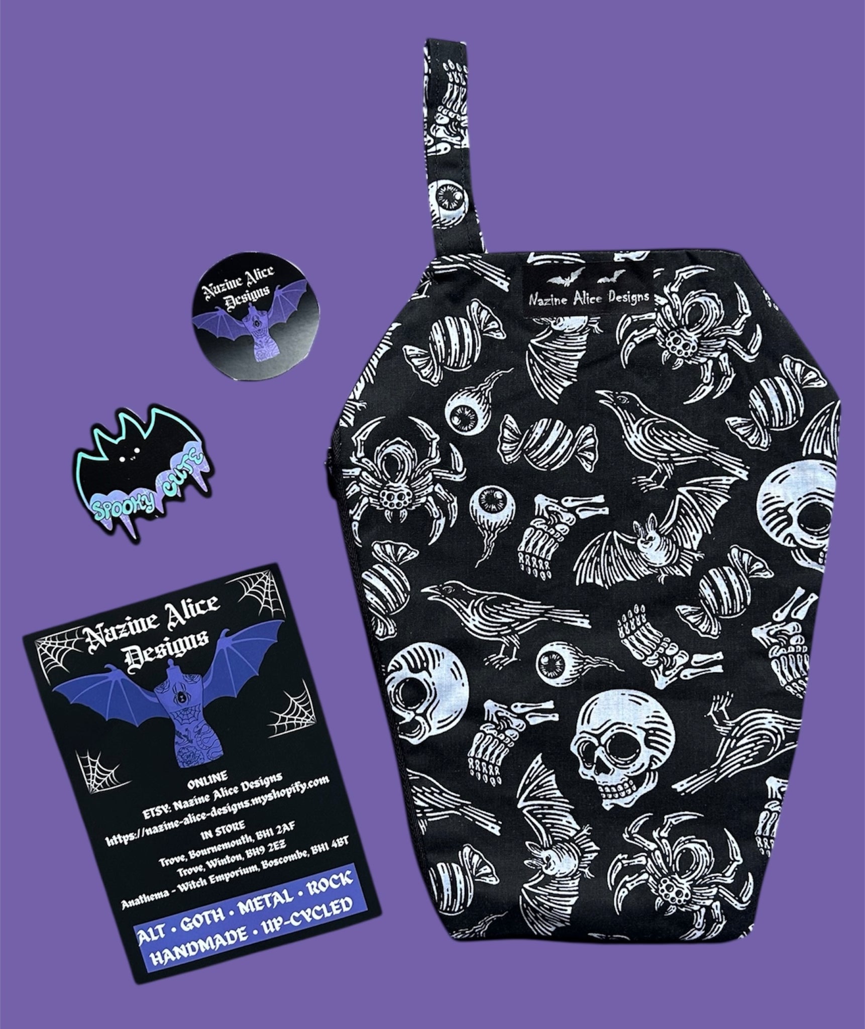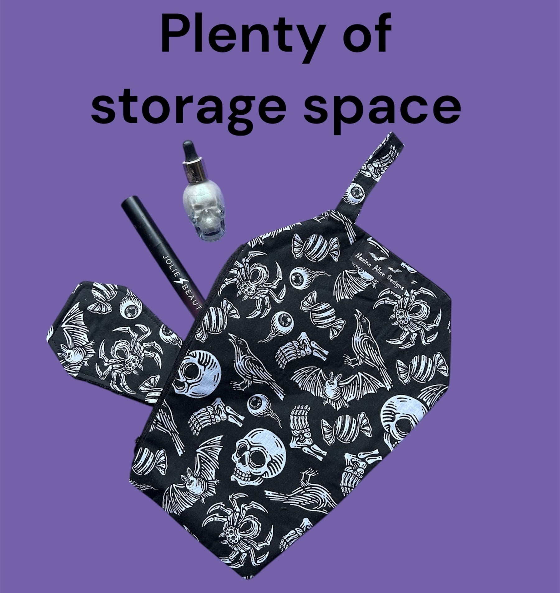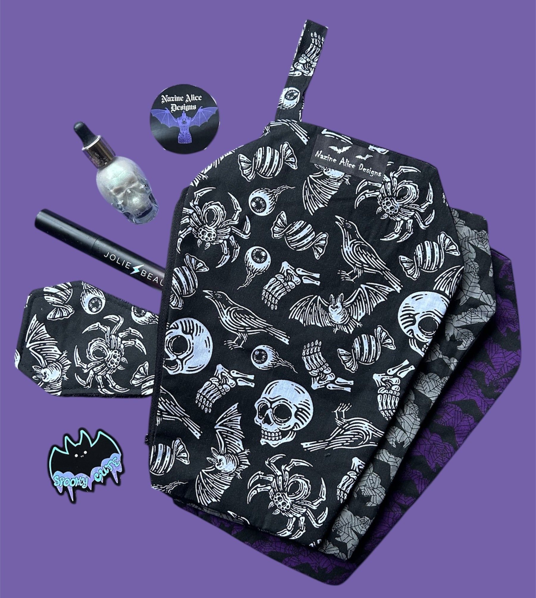 Add some gothic flair to your makeup routine with this coffin shaped cosmetics bag. With a zip up closure, finger handle and a lining fabric for sturdiness and security of all your favourite on the go makeup products. Or use it as a goth toiletries bag for when you are at festivals, gigs or having a ghoul hang at your besties place! Made from cotton based and recycled fabric for the lining. This coffin makeup bag features multiple front fabrics to choose from, trick or treat, grey and black bats or black and purple bats.