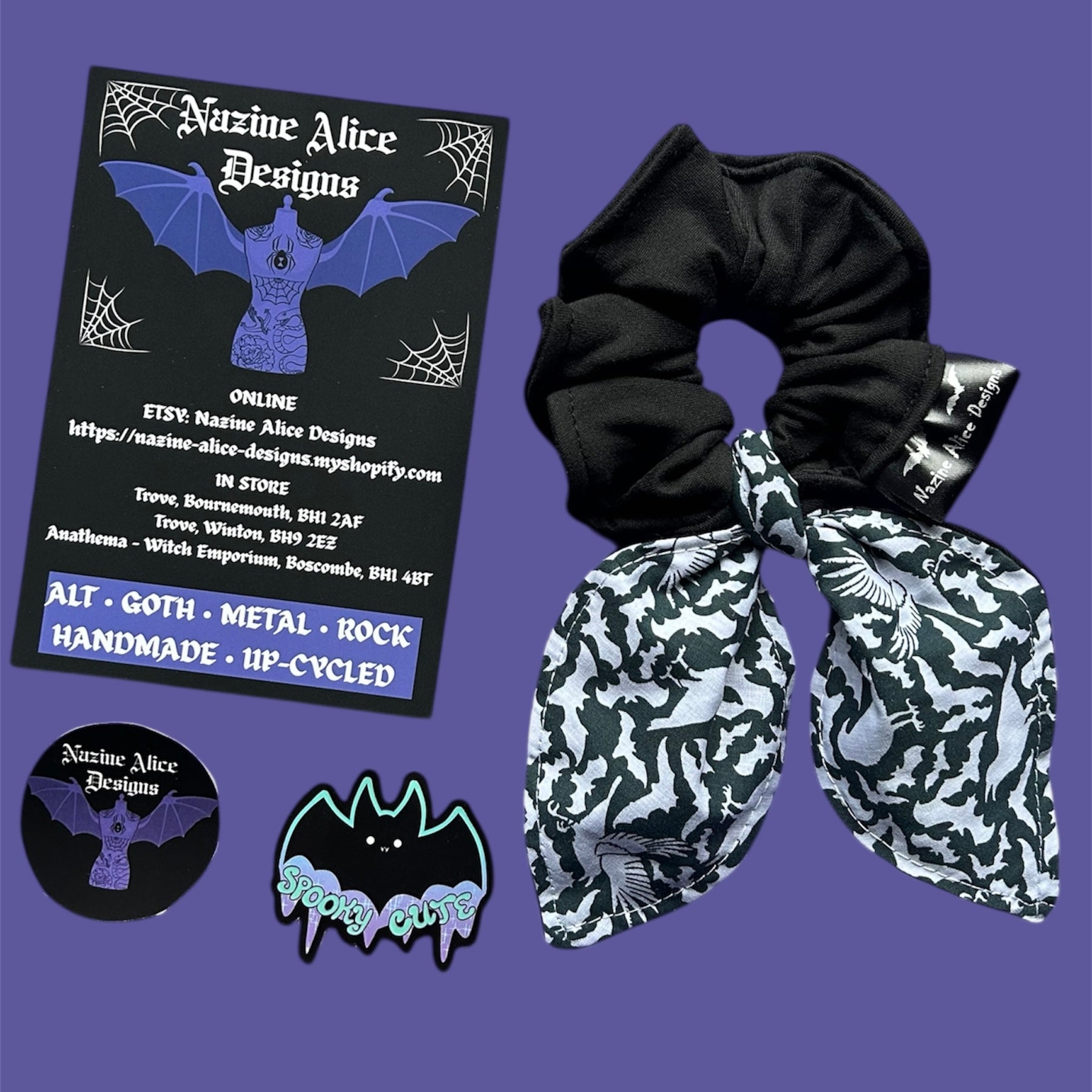 🐦‍⬛ GOTH DANGLE SCRUNCHIE 🐦‍⬛ Perfect gift for a goth of any age! (3+) Great for baby bat goths trying out a new style subtly, and great for alternative individuals with years of gothic dressing experience.