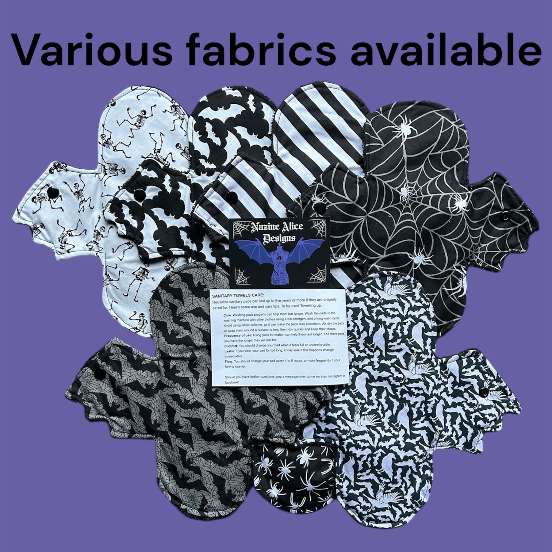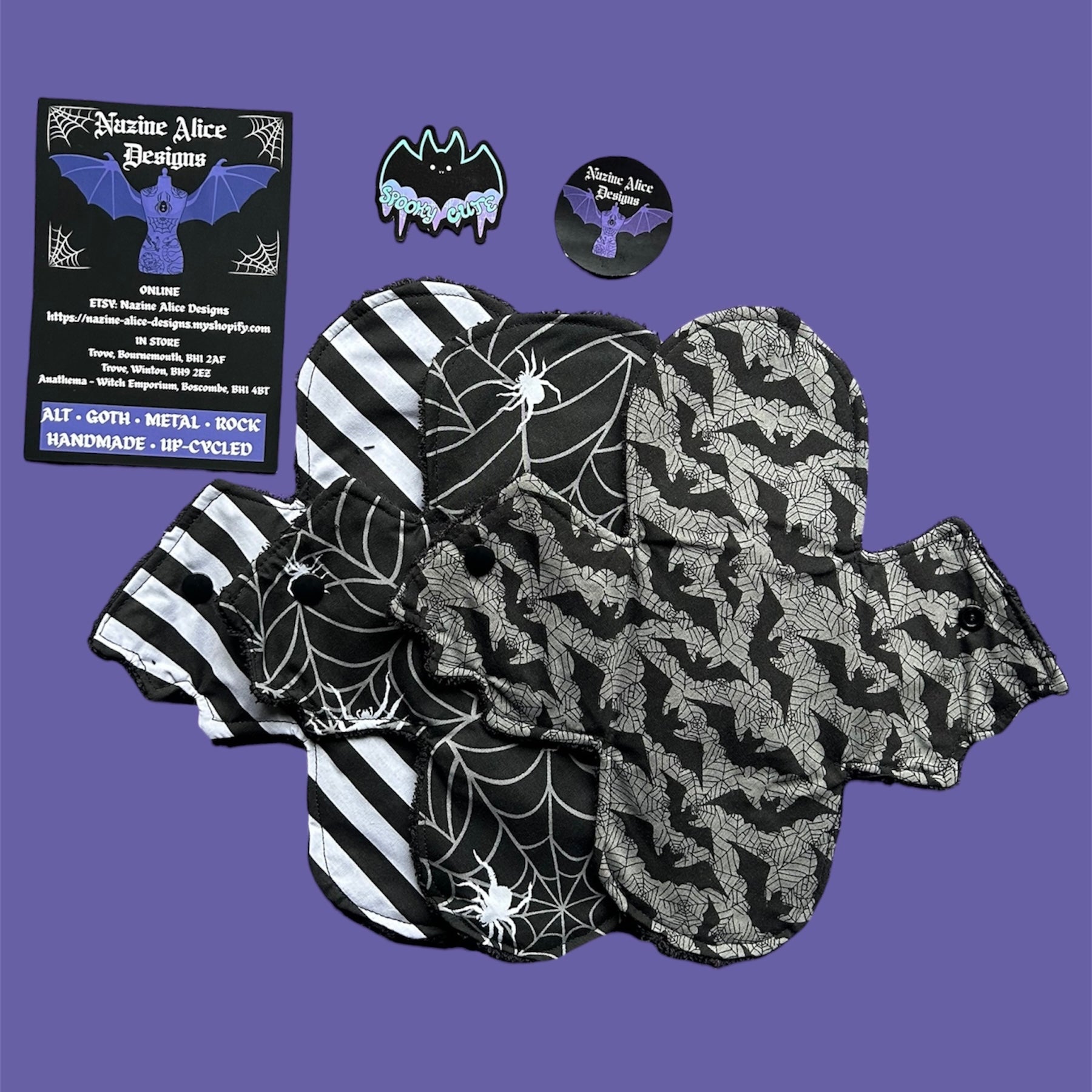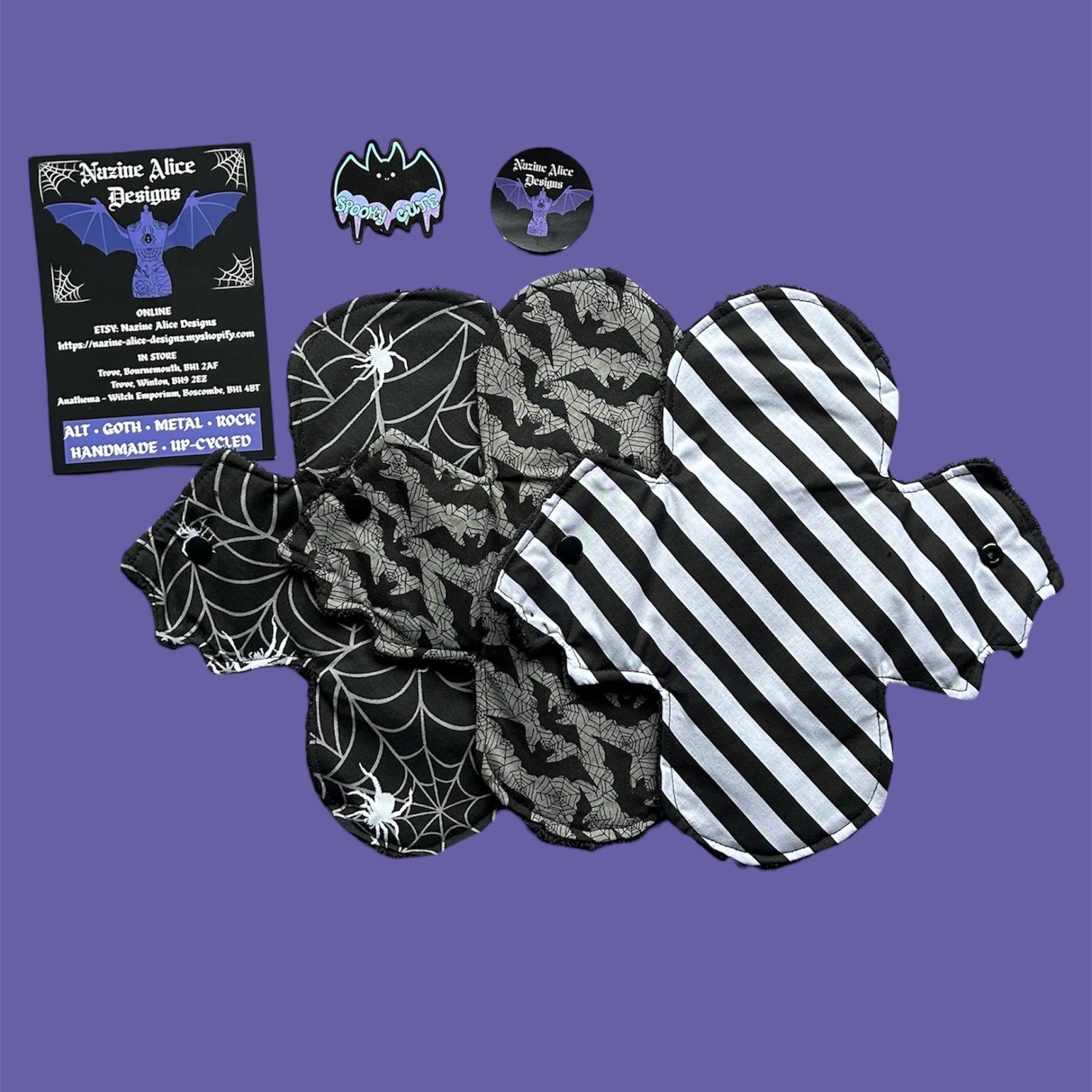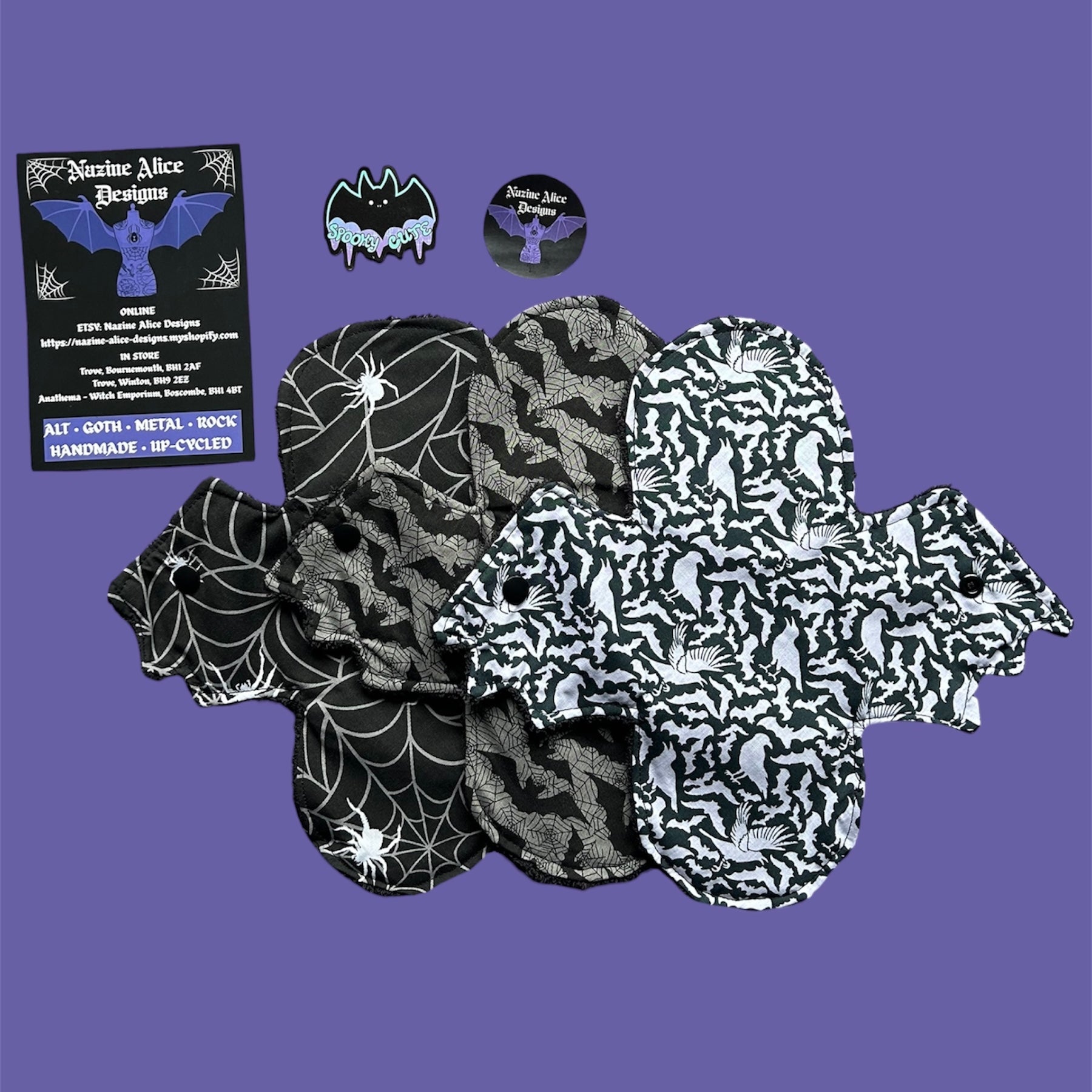 Upgrade your period care with these handmade reusable cloth sanitary pads, featuring adorable bat-wing details and stunning gothic designs like skulls, bats, spiderwebs, and ravens. Designed for comfort, absorbency, and sustainability, these pads are perfect for those who want to reduce waste without sacrificing style ✨