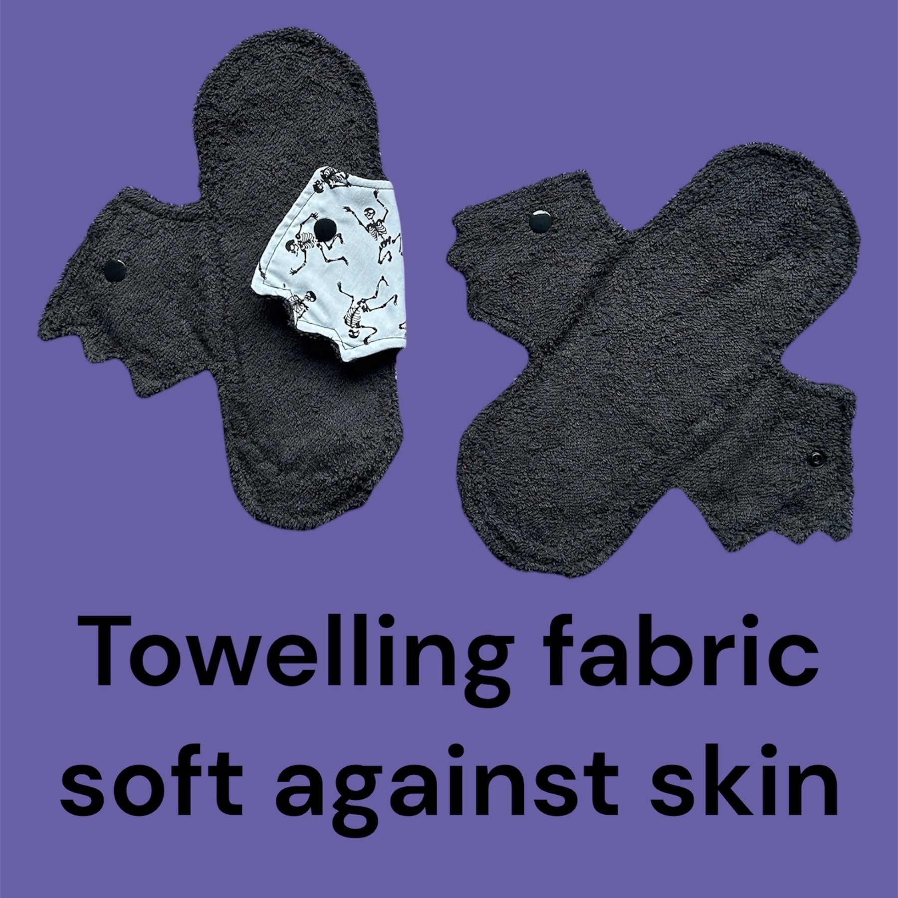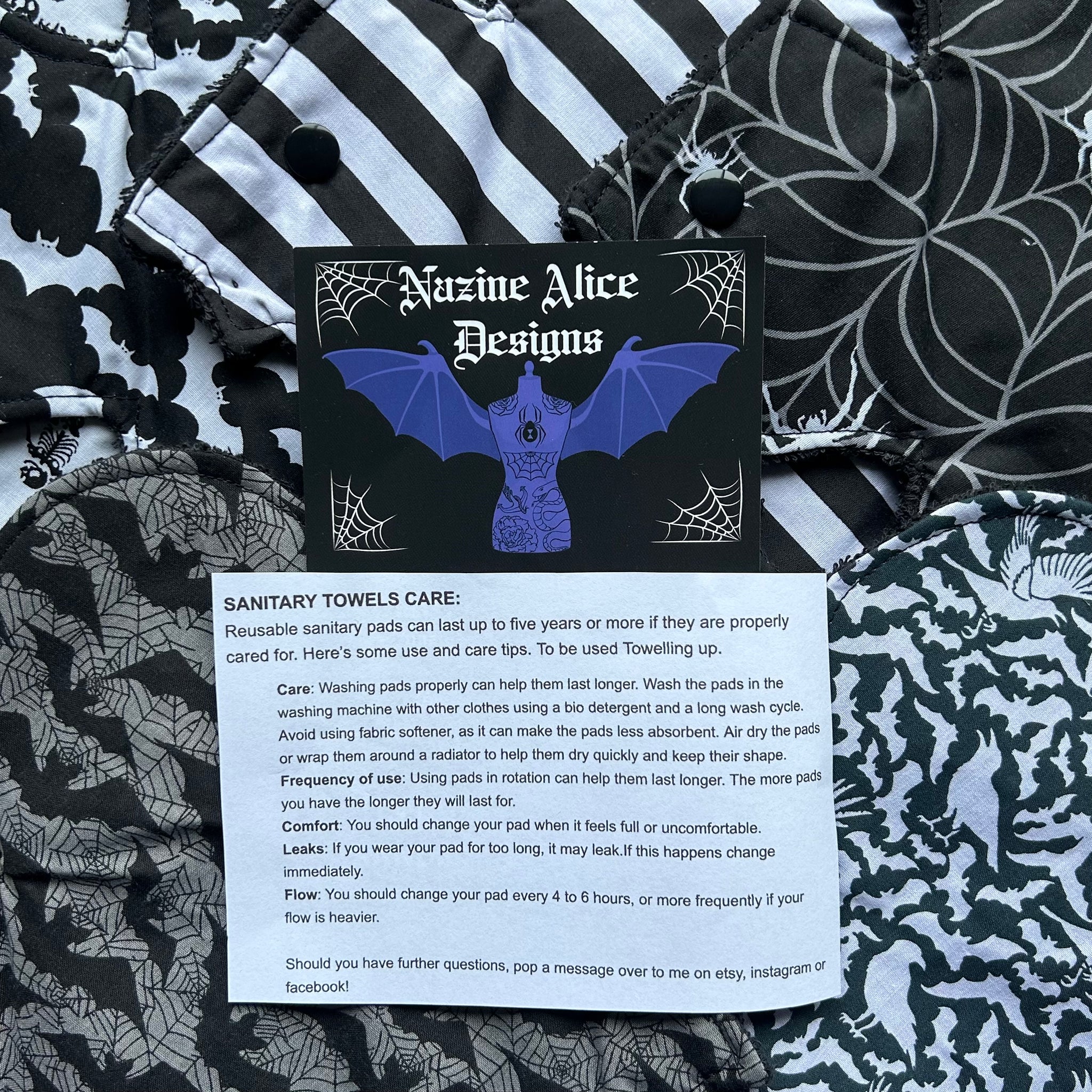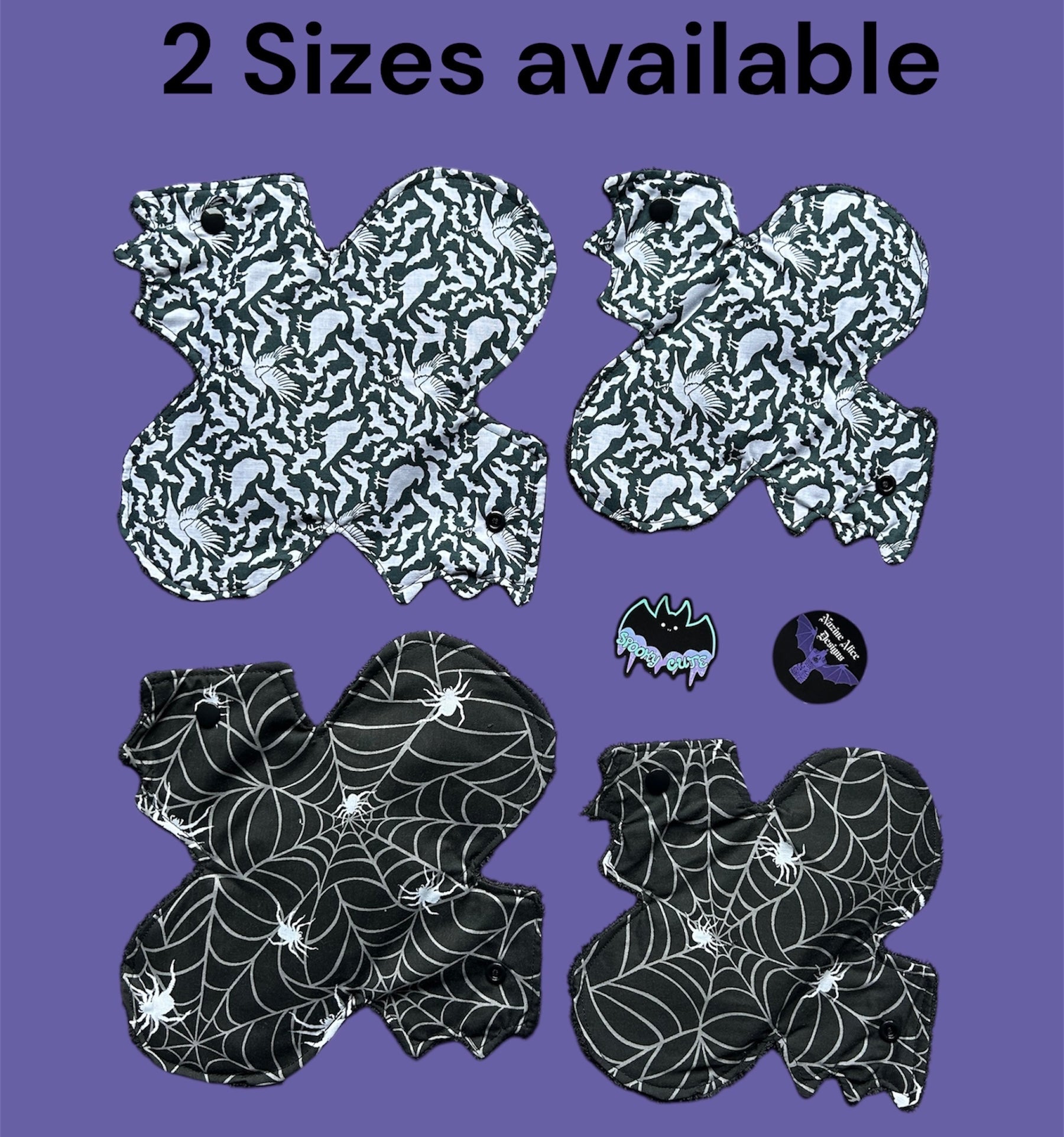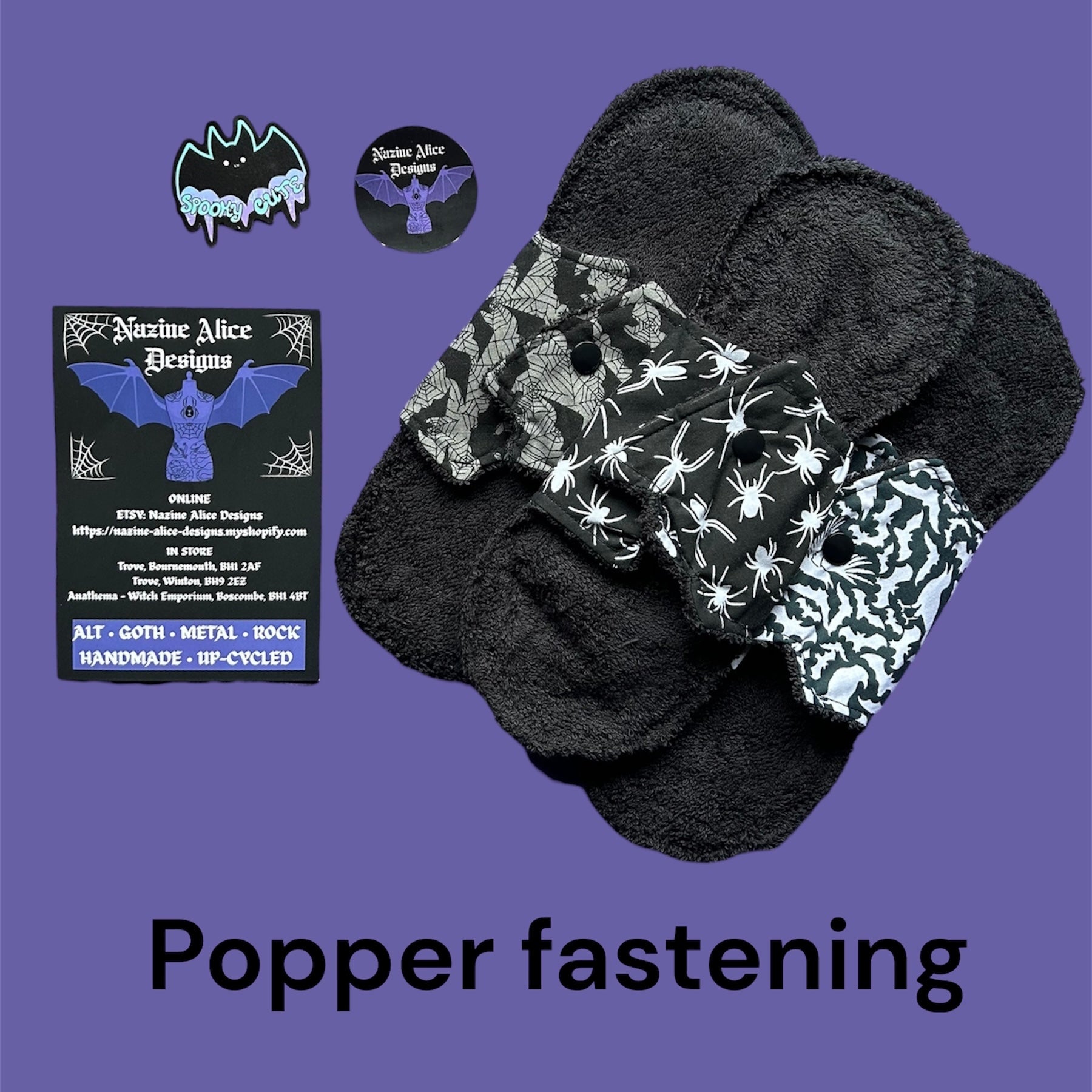 Upgrade your period care with these handmade reusable cloth sanitary pads, featuring adorable bat-wing details and stunning gothic designs like skulls, bats, spiderwebs, and ravens. Designed for comfort, absorbency, and sustainability, these pads are perfect for those who want to reduce waste without sacrificing style ✨
